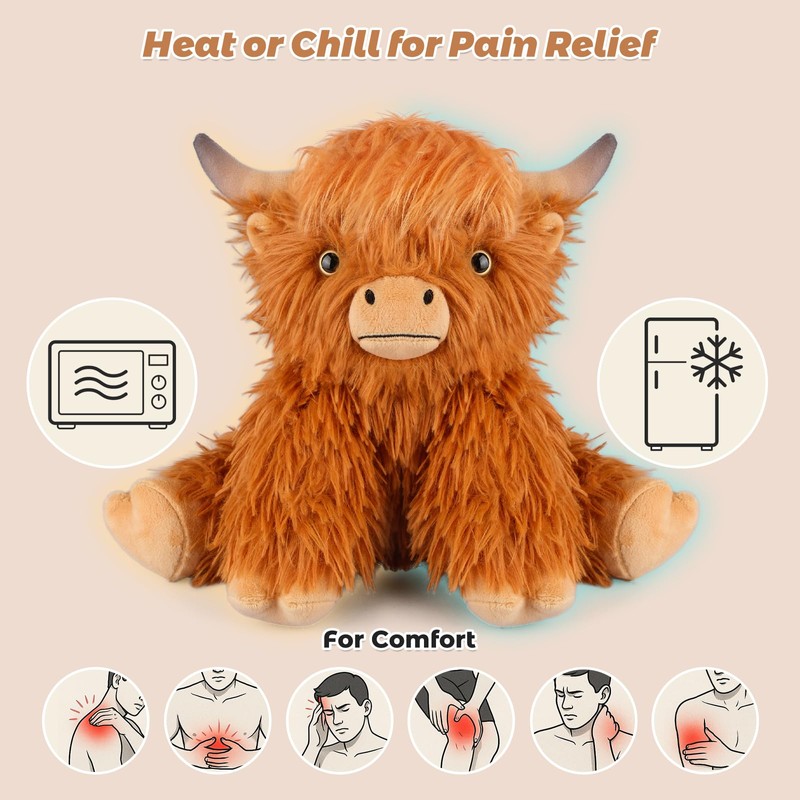 - Precision Comfort, Whenever You Need It: Experience quick, effective relief with this highland cow plushies at the perfect temperature—every time. Just 90 seconds in the microwave delivers 30 minutes of continuous moist heat - the ideal duration for relaxing muscle spasms and easing chronic pain. Need cooling instead? Two hours in the freezer provides 15 minutes of cold therapy, perfect for reducing fresh swelling or inflammation from injuries.