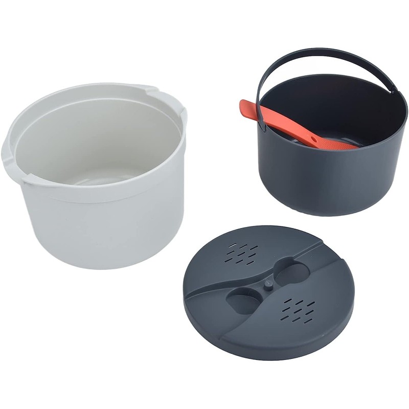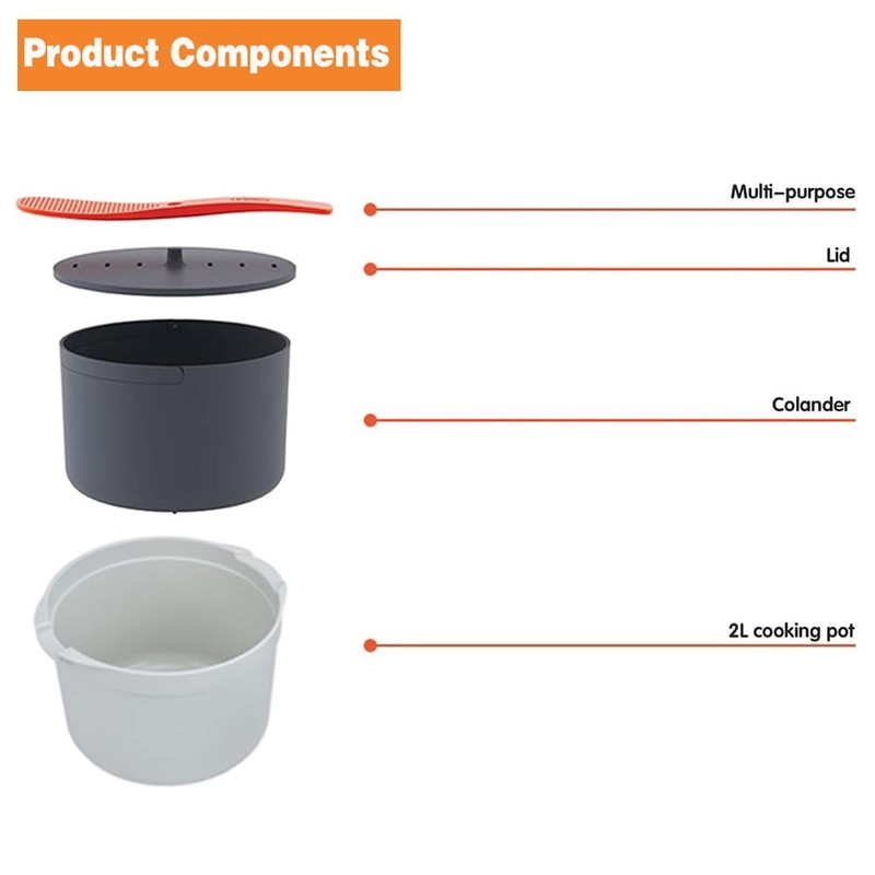 1.Humanized Design Microwave Steamer: The side of the pot is very clever, not only can store the rice spoon, but also let the rice spoon function as a handle. pot edge design can not only store rice spoons, but also let rice spoons serve as handles. A simple change can achieve multiple functions. bring your own rice spoon, pot cover, rice washing, steamer and its measuring cup, measure, wash, boil, and solve in one stop.