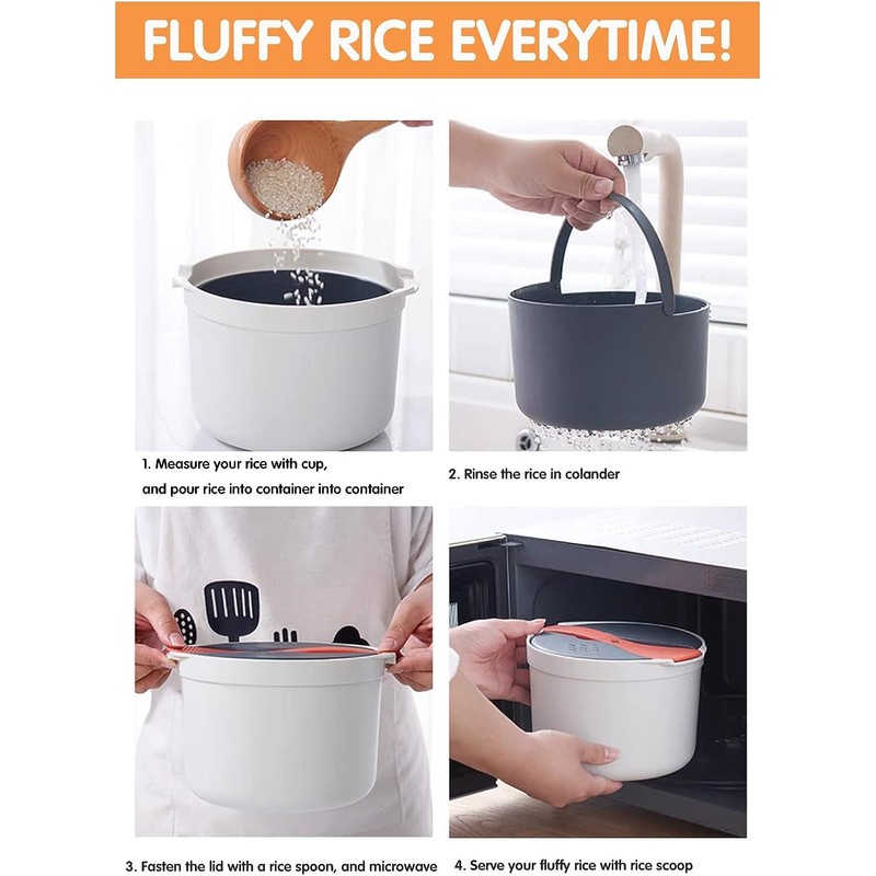 3.Specially Designed For Microwave Ovens: Our microwave rice cooker is specially designed for cooking and reheating in a microwave oven. scoop the required amount of rice with a measuring cup, pour it into the rice washing bowl, wash the rice with clean water, buckle the rice spoon and put it into the microwave oven for cooking. Simple, fashionable and beautiful, multi-purpose.