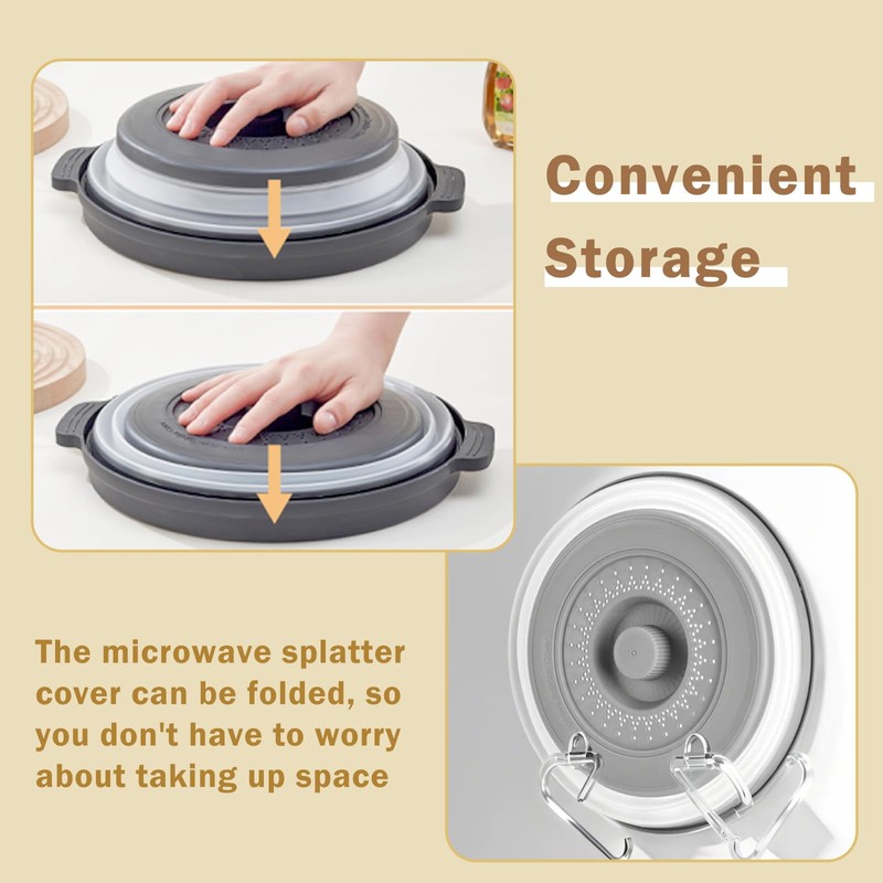 - 【Space-Saving Foldable Design】Made from durable plastic and flexible silicone, this collapsible microwave splatter cover folds down to just 1.6 inches for compact storage. The collapsible colander design makes it ideal for kitchens with limited space.