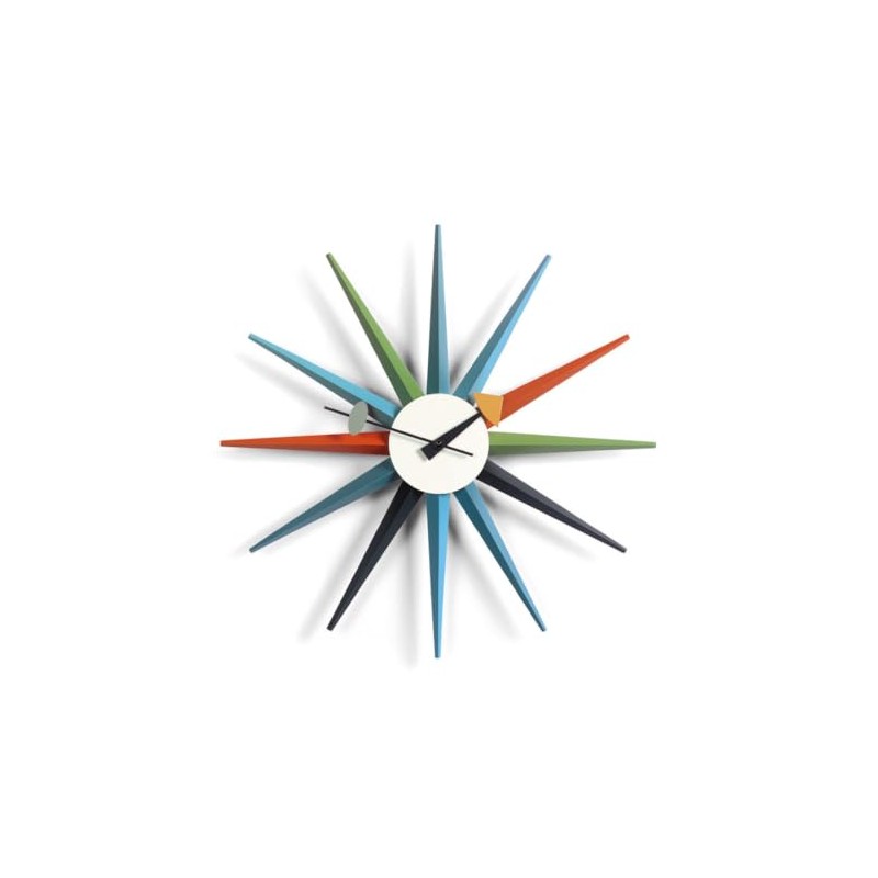 - The Wall Clock Multicolor Sunburst – George Nelson Replica is a striking homage to one of the most iconic designs of the mid-century modern era. This meticulously crafted timepiece captures the essence of George Nelson’s 1950s masterpiece, featuring a dynamic sunburst pattern with colorful, radiating wooden spokes emanating from a central clock face.