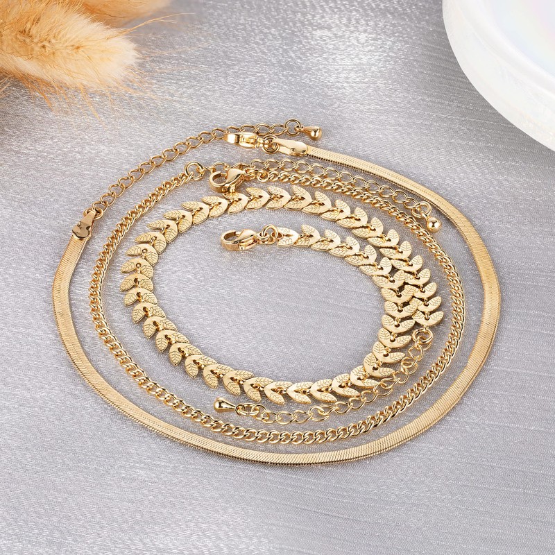 - 3pcs gold anklets set:this ankle bracelets set with 3 pcs of anklets,a cuban link,a fishbone link,and a herringbone chain design,giving it a dainty and delicate look