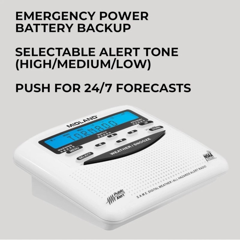 Stay informed and prepared with the Midland WR-120 Emergency Weather Alert Radio. This dependable device offers a crisp white finish, seamlessly blending with your home decor while standing ready to deliver vital weather information. The integrated alarm clock feature ensures you start your day on time, while the portable design makes it easy to take along to your emergency shelters or workplaces.The Midland WR-120 is equipped with clear AM/FM radio capabilities, allowing you to tune into your preferred stations for news, music, and more. Its user-friendly interface and robust construction make it a reliable source of information during any emergency situation, ensuring you are always connected to the latest updates and warnings.