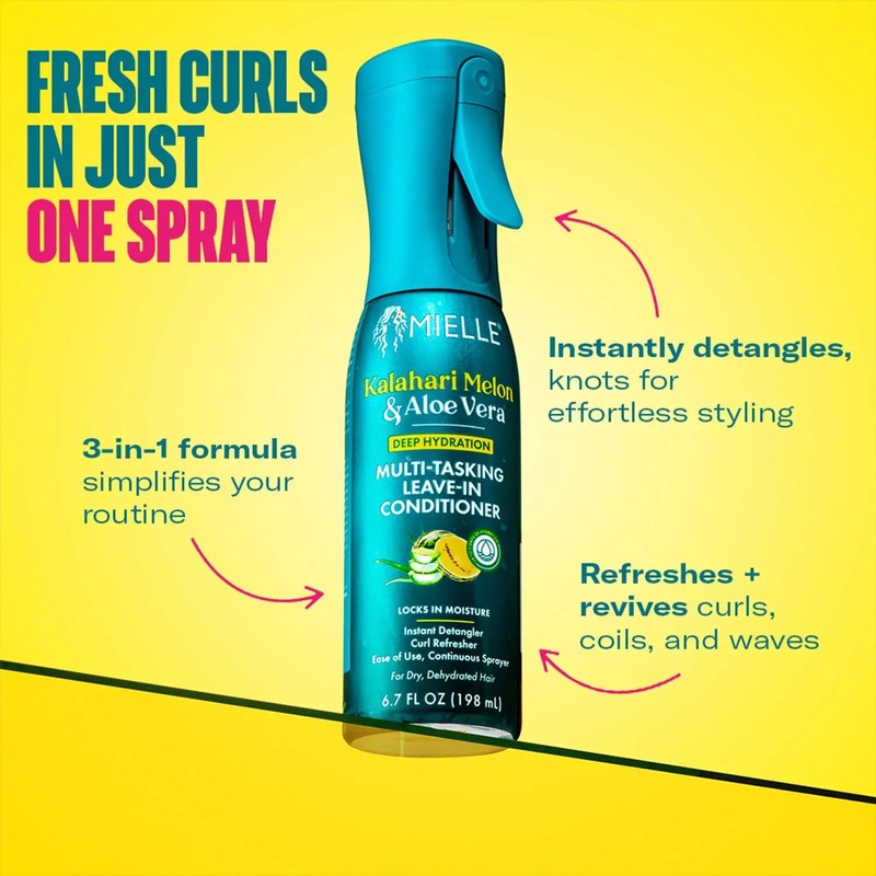 Mielle Kalahari Melon & Aloe Vera Multi-Tasking Leave In Conditioner Spray - 3-in-1 Hair Detangler Spray, Curl Refresher & Moisturizer for Dry, Curly & Textured Hair - Up to 5 Days of Moisture (6.7oz)