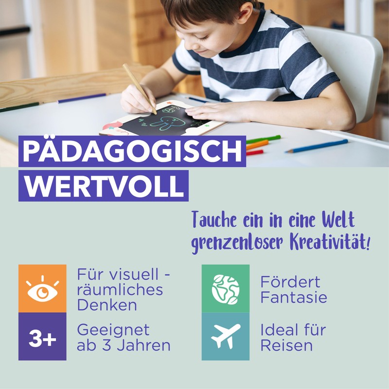 - LCD drawing tablet – promotes creativity: the vibrant colours of our children's painting board stimulate the sense of colour of boys and girls and allow them to let their imagination run wild