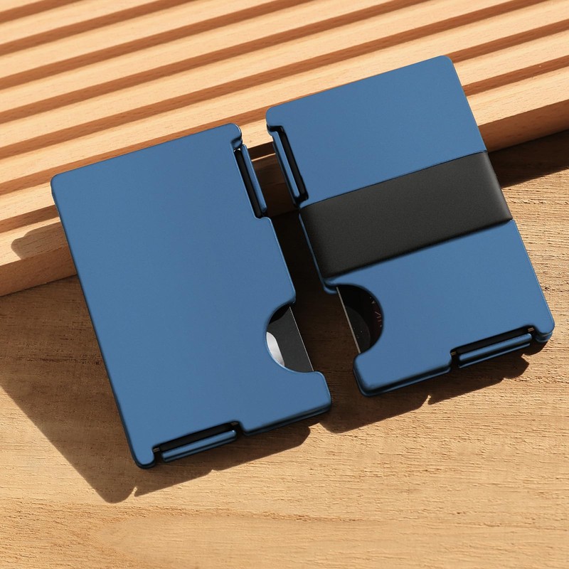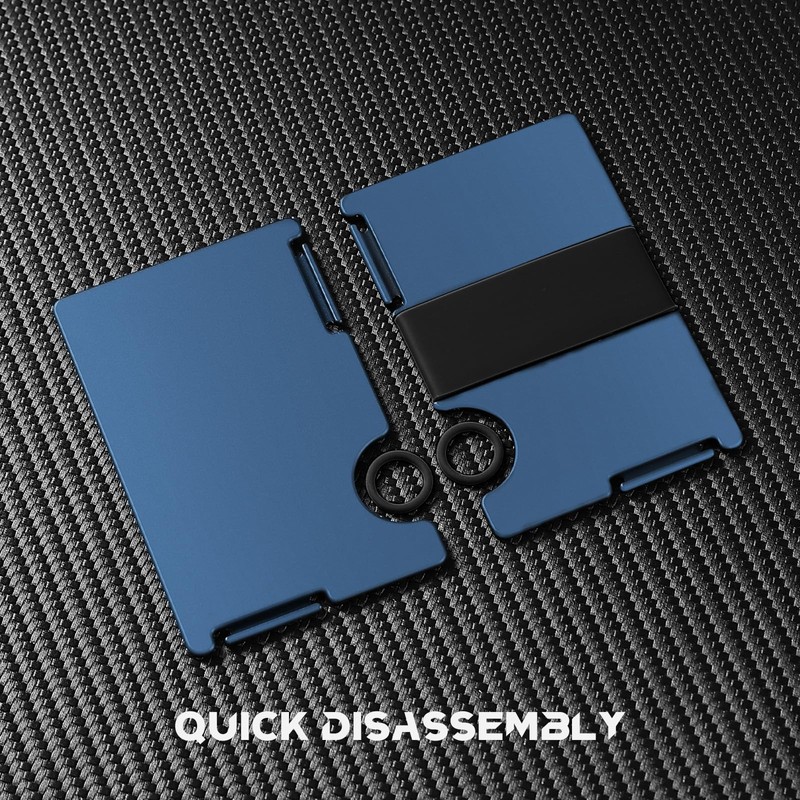 - INNOVATIVE CARD HOLDER - Two small black silicone rings make removing the cards quite easy without the need for tools. The navy blue aluminum wallet comes with a black silicone bill band for banknotes that keeps your bills neat and allows quick access