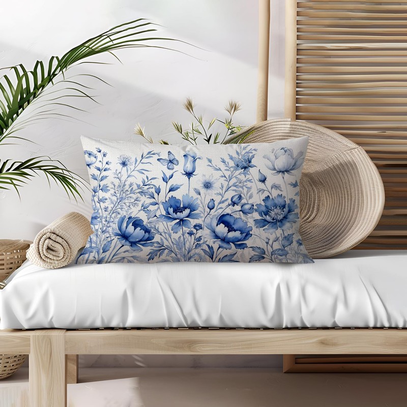 - Elegant Floral Design: This 12x20 inch lumbar pillow cover features a stunning blue and white floral pattern, showcasing a variety of beautiful flowers and delicate butterflies, adding a touch of sophistication to your decor.