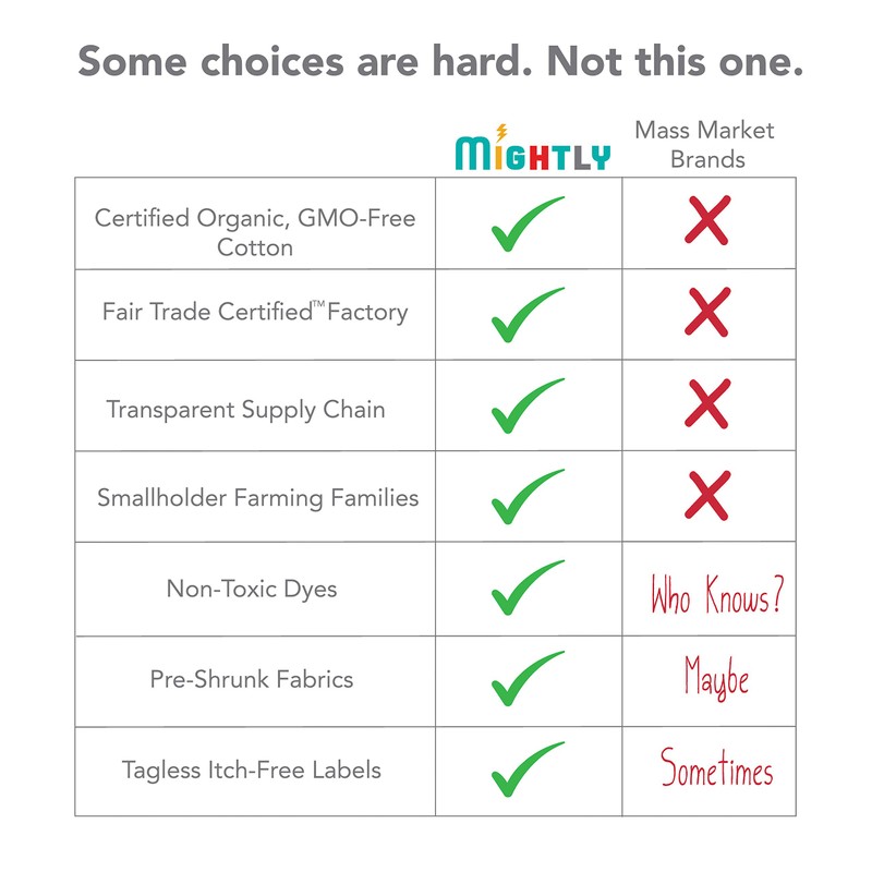 - 100% ORGANIC COTTON - Mightly children’s clothes are certified to the Global Organic Textile Standard (GOTS). They are imported from India and made with certified organic cotton and non-toxic dyes and inks. Our dye process results in long-lasting color that won't irritate sensitive skin. Mightly’s GOTS ID# is OT-034929.