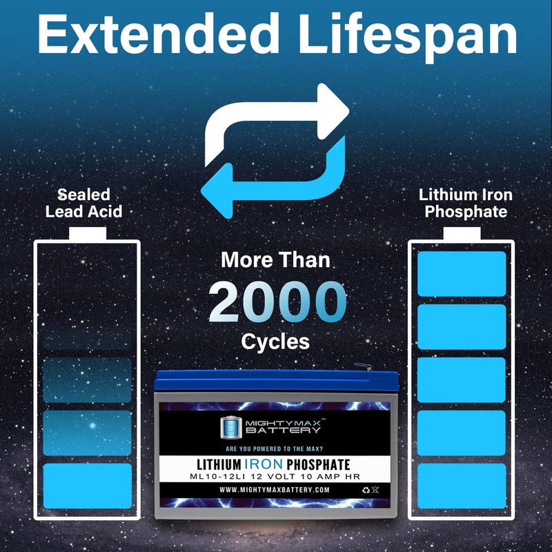 • ML10-12LI is a 12V 10Ah Lithium iron phosphate sealed, rechargeable and maintenance free battery. Direct drop in lead acid replacement - Pack of 3