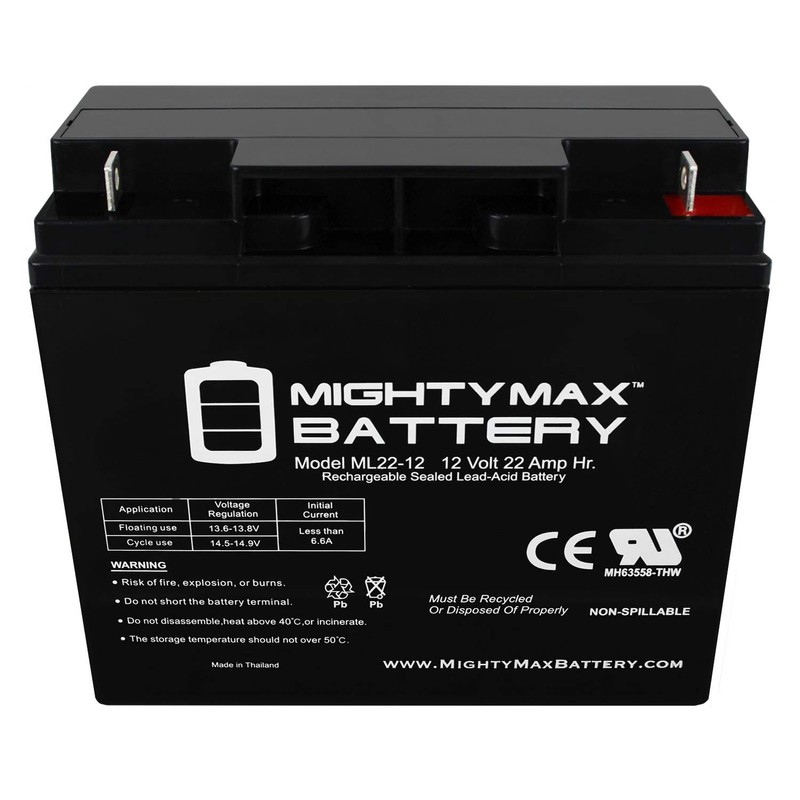 Delivering power when you need it, the Mighty Max ML22-12 12 Volt 22 AH uses a state of the art, heavy-duty, calcium-alloy grid that provides exceptional performance and service life in both float and cyclic applications. The ML22-12 is an Absorbent Glass Mat (AGM) technology with a valve regulated design, that can be used in enclosed and indoor environments without leaking or maintenance, providing a superior performance for thousands of models. Mighty Max SLA batteries are utilized in a wide variety of applications including; Consumer Electronics, Electric Vehicles, Engine Starters, Golf Carts, Hunting, Lawn and Garden Tools, Medical Mobility, Motorcycles, Power sports, Portable Tools, Solar, Toys and Hobby, Access Control Devices, Emergency Lighting, Security and more. **Specifications:** Voltage: 12 Volt Amperage: 22 AH Chemistry: SLA, AGM Terminal: Nut and Bolt (NB) **Battery Dimensions:** 7.13 in x 3.01 in x 6.57 in Weight: 13.01 Lbs **Warranty** 1 Year Genuine Mighty Max battery Product