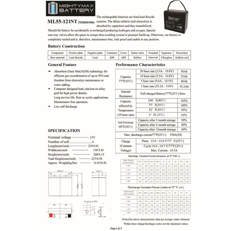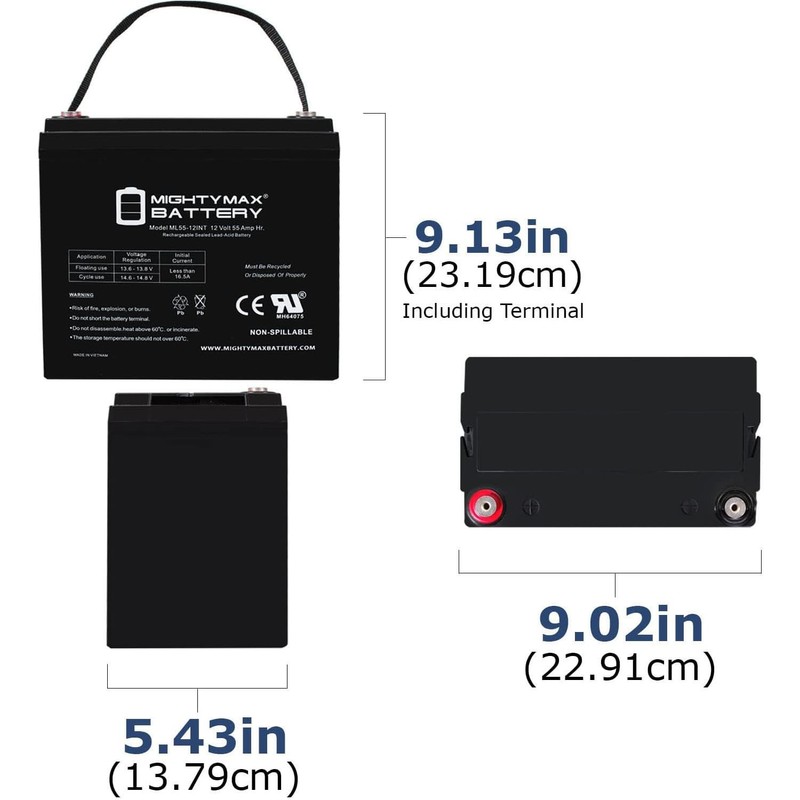 - ML55-12 Internal Thread is a 12V 55AH Sealed Lead Acid (SLA) rechargeable maintenance free battery - UL Certified
