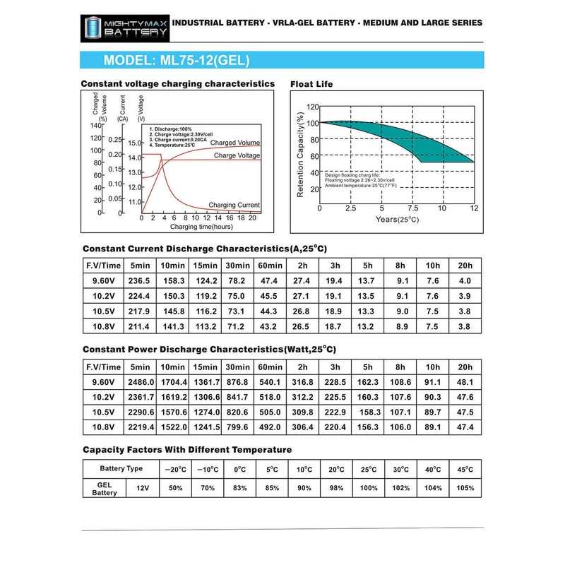 • ML75-12 GEL is a 12V 75AH GEL rechargeable maintenance free battery - UL Certified