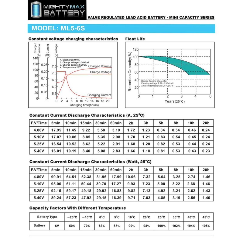- ML5-6S SLA is a 6V 5AH Sealed Lead Acid (SLA) rechargeable maintenance free battery - UL Certified