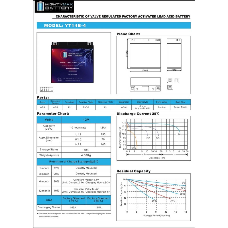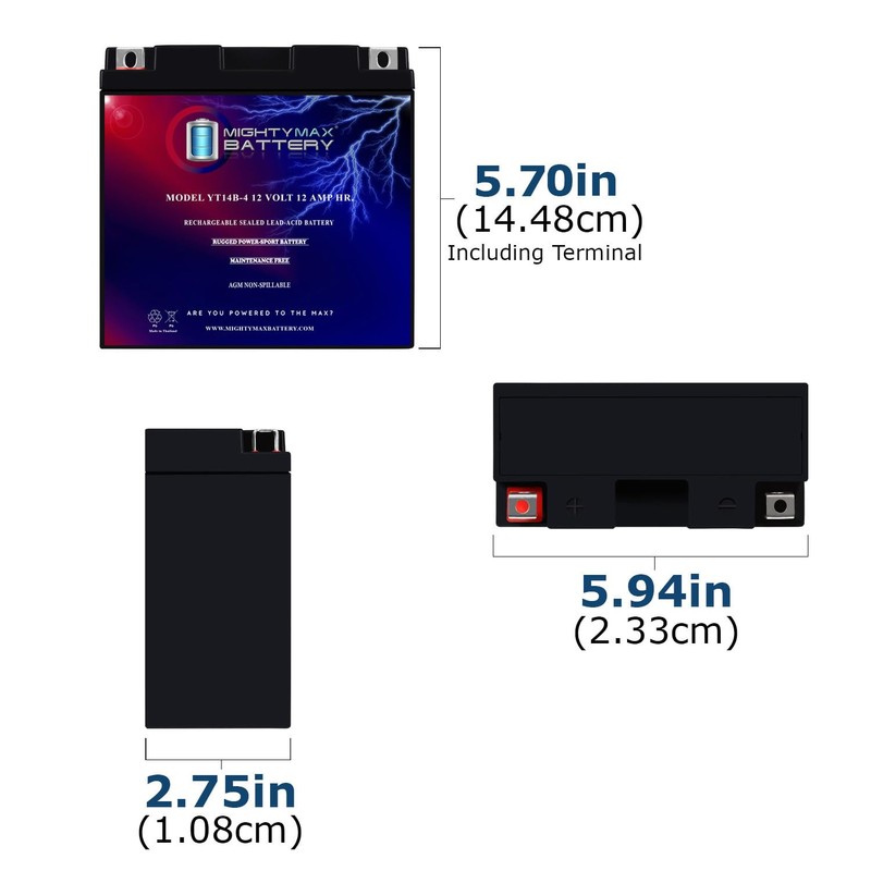 • YT14B-4 is a 12V 12AH 115 Cold Cranking Amps (CCA) Sealed Lead Acid (SLA) Battery