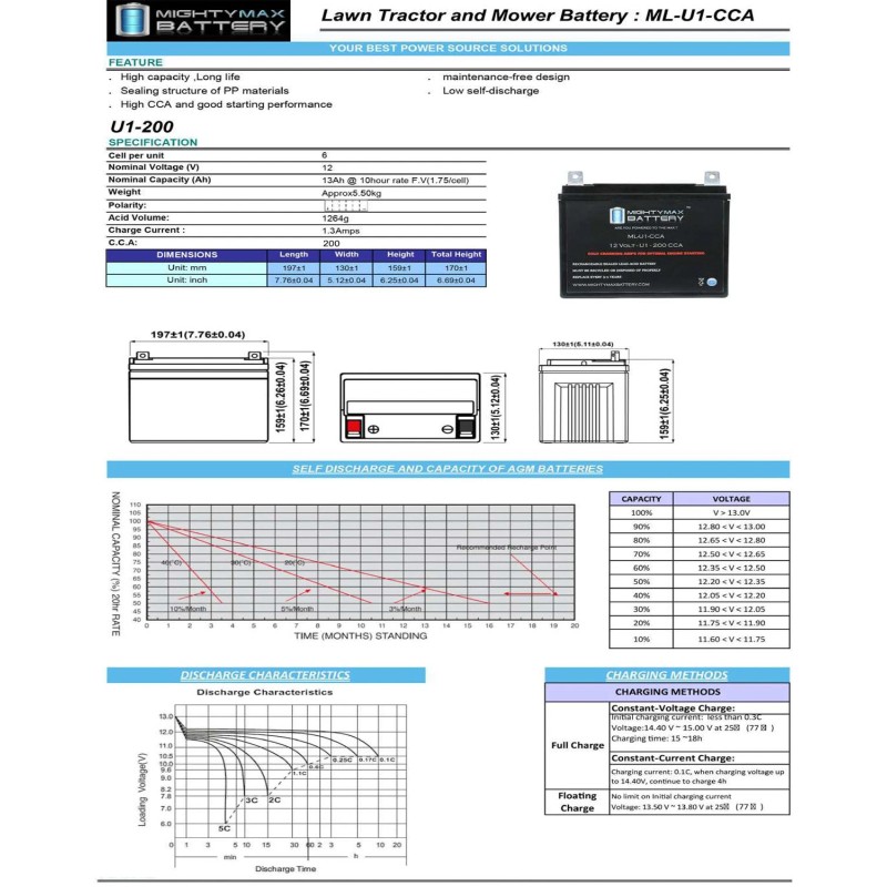This ML-U1-CCA 12 volts 200 CCA absorbed glass mat (AGM) battery is made with the highest quality pure virgin lead (99.99%) to create a long lasting, durable power source for any machinery requiring a cold cranking power source.