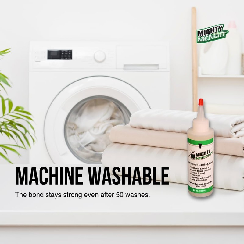 - SUPER STRONG ADHESIVE MIGHTY MENDIT bonding agent grabs and adheres to virtually any fabric including denim, leather, and corduroy. Permanent adhesive interlocks the fibers in a fabric to repair tears in clothing, furniture upholstery, and other mending needs.