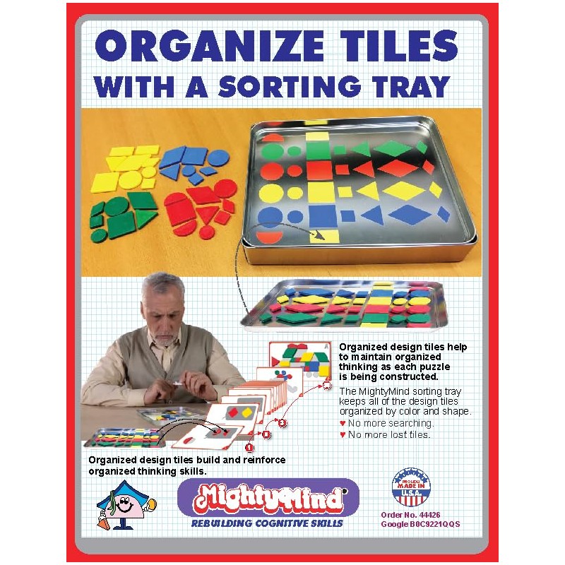 - ▓ Using the MightyMind Design Tile SortingTray also rebuilds cognitive skills and dexterity as parts are repeatedly sorted on the tray.