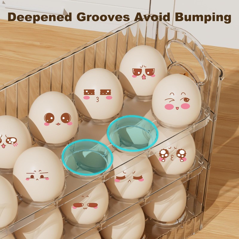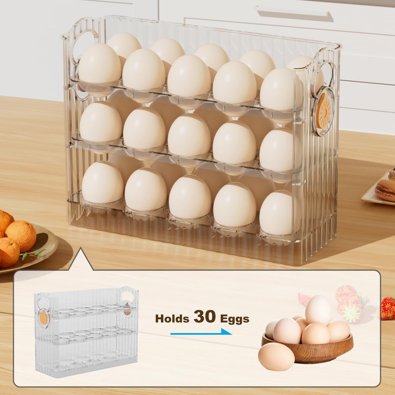 - Save Space Our 3-tier large capacity egg storage for refrigerator can store about 30 eggs. Keeps otherwise cluttered eggs neatly organized in the egg container. Its compact size optimizes the space in the refrigerator or kitchen countertop without taking up extra space, making life neater and more organized.