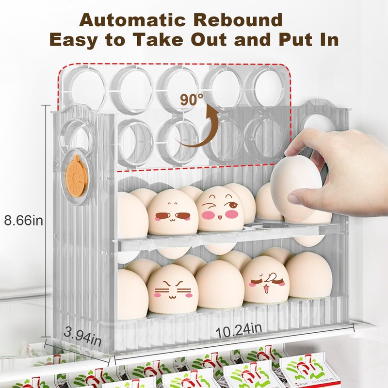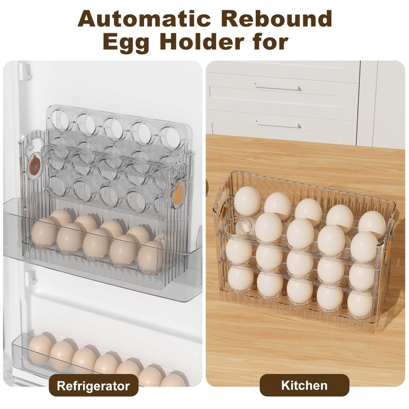 - Automatic Rebound Our new egg holder for fridge features an automatic rebound design, eggs are easy to take out and put in. When you remove each layer of eggs, the egg dispenser will automatically rebound, no need to operate by hand, very convenient to use.