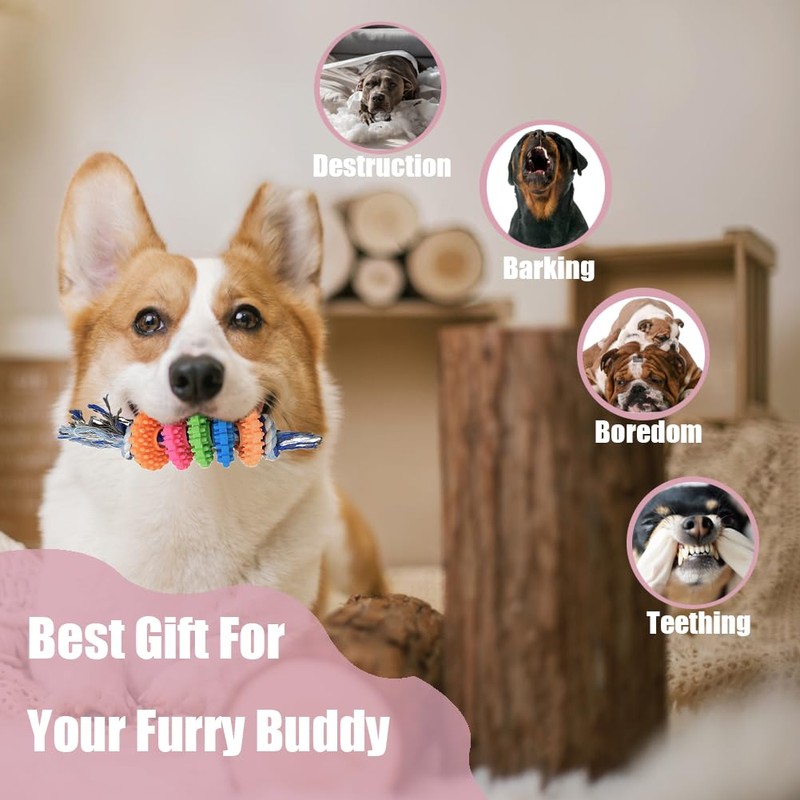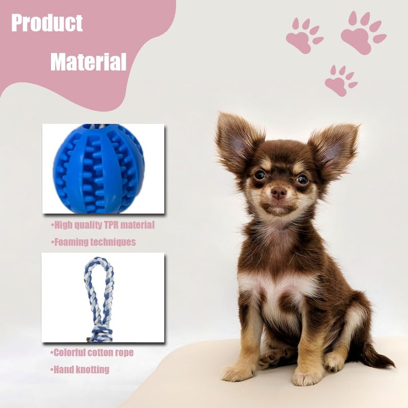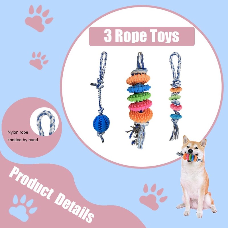 - Durable Dog Rope Toys for Chewing: These TPR dog rope toys come in three unique knot designs, each featuring colorful balls or rings for added texture. These chew toys for dogs are perfect for dogs who love to chew and play.