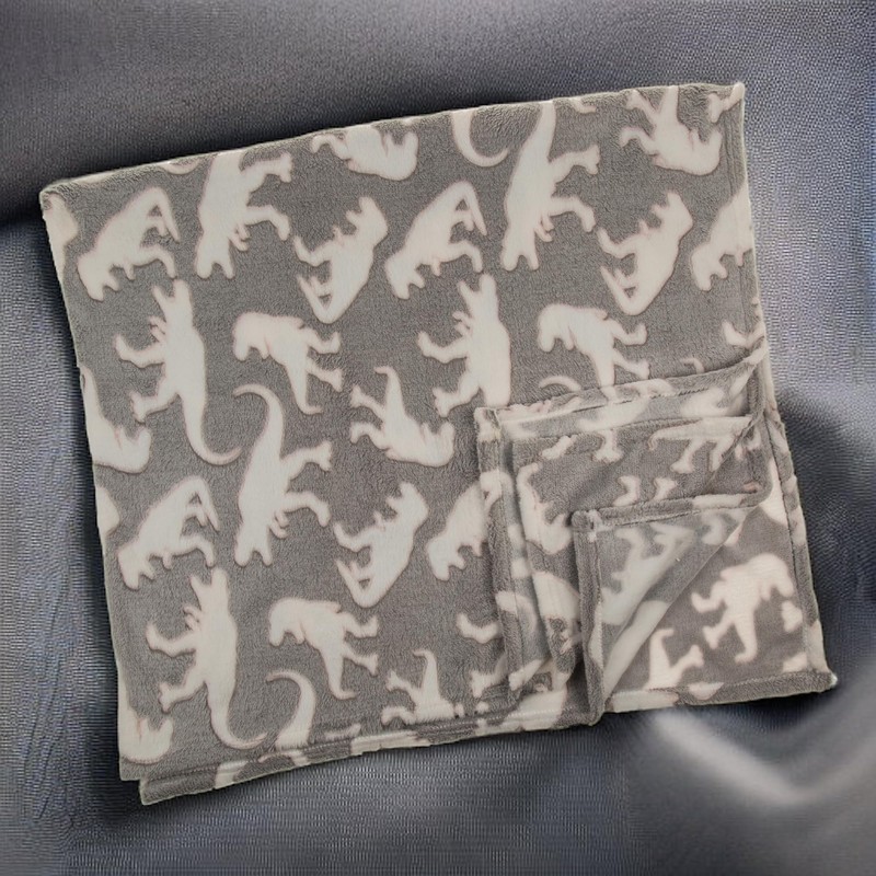 MIJOMA Cuddly Blanket with Photoluminescent Motif - Stylish Blanket with Unique Glow-in-the-Dark Effect - Perfect for Cuddling - Polyester - Colour Grey (Dinosaur, 150 x 130 cm)
