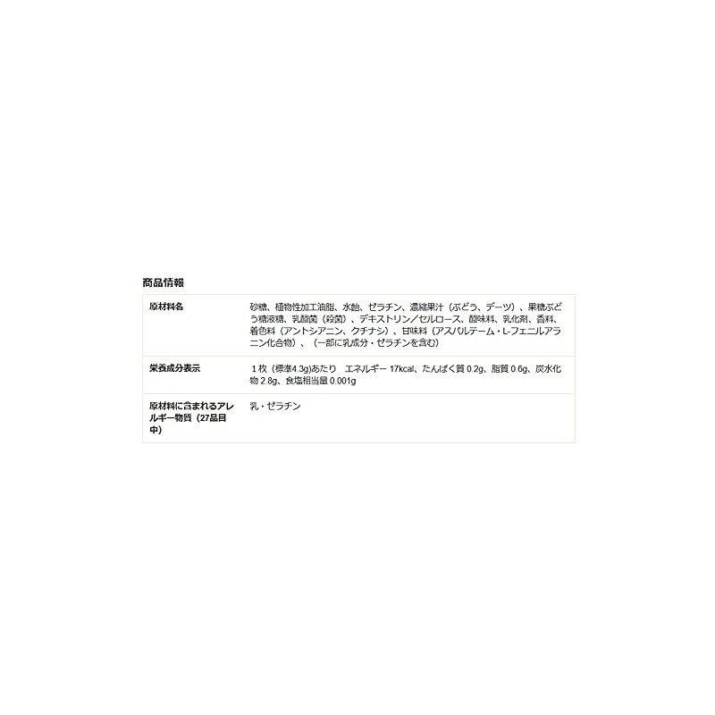 • Ingredients: Sugar, vegetable oil and oil, sugar syrup, collagen, reduced sugar syrup, concentrated grape juice, xylooligosaccharide, bifidobacteria powder, cellulose, acidulant, emulsifier, flavoring, sweeteners (aspartame, L-phenylalanine compound), coloring (purple carroint) (ingredients include soy, milk, gelatin)