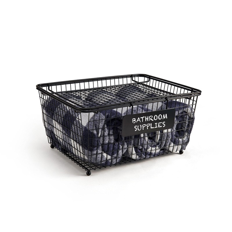 Mikasa Gourmet Basics Chalkboard Stackable Storage Basket with Lid, Wire Frame Storage Basket for Home - Handcrafted Iron, Removable Chalkboard Label, Versatile & Stylish (13.5" x 10.5" x 6")