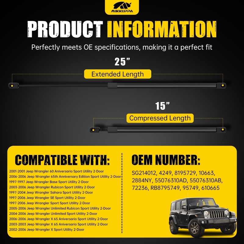 • [Vehicle Models]: This rear window galss support struts replacement for 1997-2006 Jeep Wrangler. Extended Length: 25 inch, Compressed Length: 15 inch