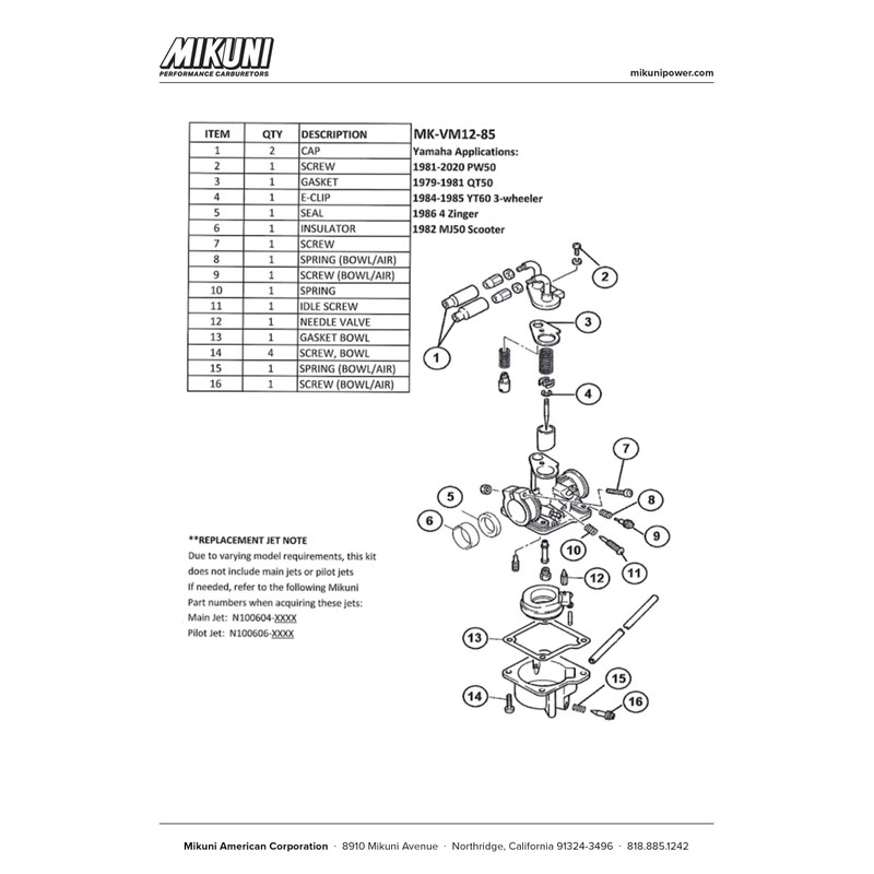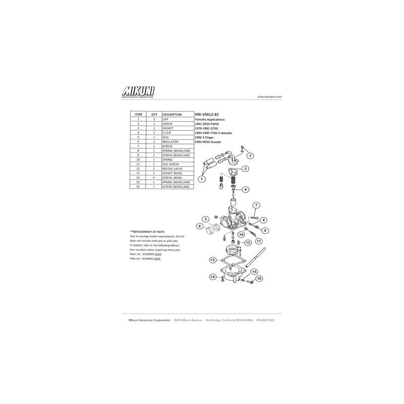 Refresh your engine’s performance with a Genuine Mikuni Carburetor Rebuild Kit, designed specifically for Mikuni VM carburetors used in Yamaha motorcycles, scooters, and 3-wheelers. Whether you're restoring a vintage ride or maintaining a mini bike, this kit delivers OEM-level quality for dependable results.