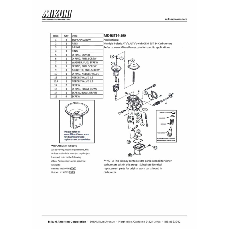 Genuine Mikuni Carburetor Rebuild Kits contain an assortment of critical parts which may include gaskets, diaphragms, seals, hardware, and more. This kit contains parts needed to rebuild one Mikuni BST Carburetor for Polaris ATVs & UTVs.Fits: 2005 Polaris ATP 330 4x4 1998 Polaris Big Boss 500 6x6 2006C2014 Polaris Hawkeye 300 2x4, 4x4 2002 Polaris International Boss 6x6 2002 Polaris LUH 6x6 SXS 2005C2006 Polaris Magnum 330 2x4, 4x4 1997C1998 Magnum 425 2x4, 4x4, 6x6 2000C2003 Polaris Magnum 500 4x4 ATV 1999 Polaris Magnum 500 ATV 2002 Polaris Pro 400 4x4 SXS 2010C2012 Polaris Ranger 400 4x4 SXS 2013C2014 Polaris Ranger 400 UTV 1999 Polaris Ranger SXS UTV 2006C2007 Polaris Ranger SXS UTV 500 2x4, 4x4 2008C2009 Polaris Ranger SXS, UTV 2x4 Polaris Series 10 PTV 4x4 SXS Polaris Series 10 Ranger Polaris Series 10 UTV 2x4 SXS Polaris Series 11 Ranger 2008C2010 Polaris Sportsman 300 4x4 1999C2008 Polaris Sportsman 335 2008C2012 Polaris Sportsman 400 4x4 ATV 2001C2005 Polaris Sportsman 400 ATV 2006C2007 Polaris Sportsman 450 ATV 1996C2000 Polaris Sportsman 500 ATV 2003C2005 Polaris Sportsman 600 ATV 2002C2008 Polaris Sportsman 6x6 ATV 2002C2006 Polaris Sportsman 700 ATV 2005 Polaris Sportsman MV7 ATV 2008C2013 Polaris Trail Blazer 330 2005C2013 Polaris Trail Boss 330 1999 Polaris Worker 335 2000C2002 Xpedition 425 ATV 1997 Polaris Xplorer 500 ATV