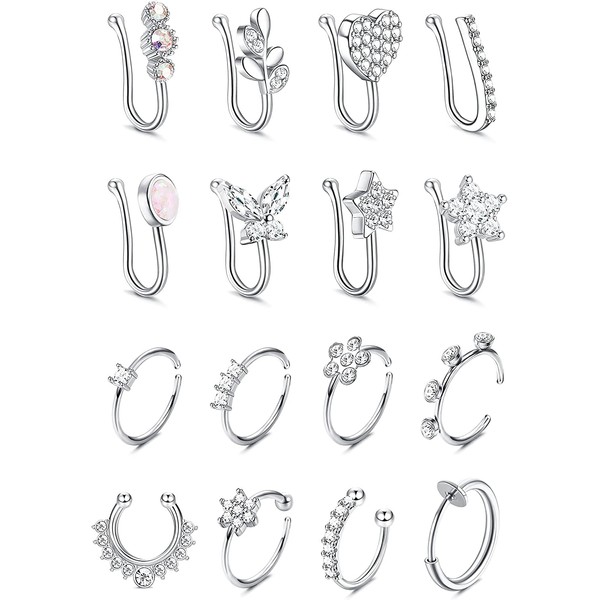 MILACOLATO 16Pcs Nose Cuff Fake Nose Ring Hoop Clip on Nose Ring Cubic Zirconia Fake Septum Nose Ring Cartilage Tragus Ring Nose Cuff Non Piercing for Women Men Silver