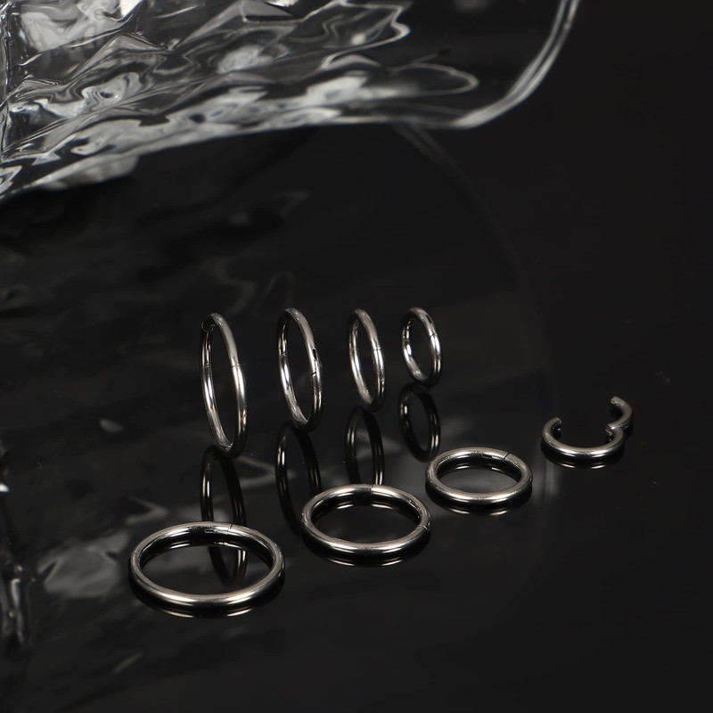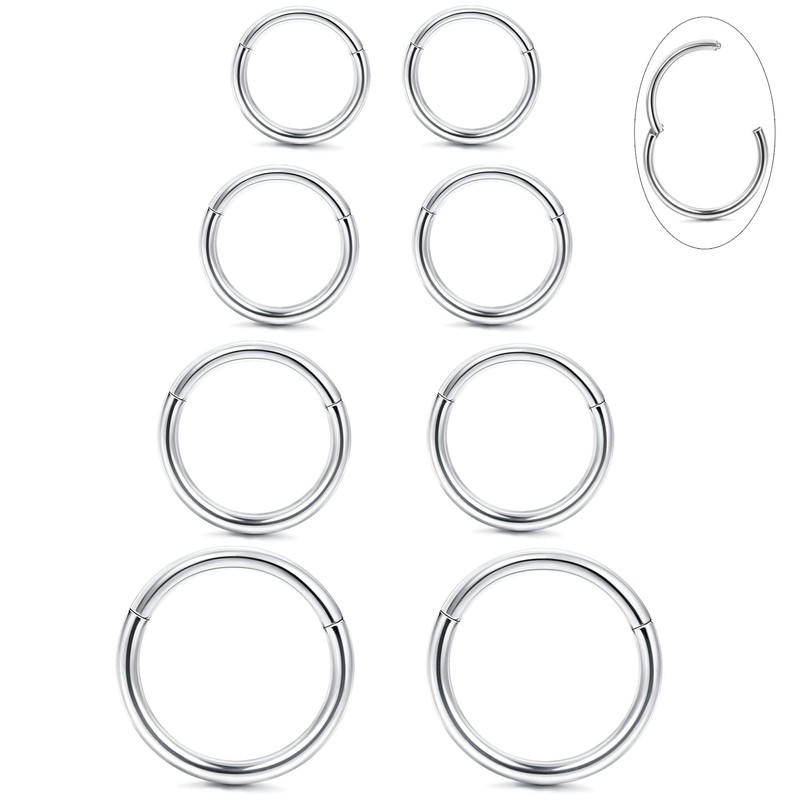 - HOOP PIERCING SIZE-One Order Come With 4 Pairs(8Pcs)Improved hinged hoop earrings With Different Sizes,Pin Gauge size:16 Gauge (1.2mm),Inner Diameter 1/4"(6mm),5/16" (8mm), 3/8"(10mm),1/2"(12mm).Color:G23 Titanium Silver,Golden,Rose Golden,Black,Perfect for body piercings