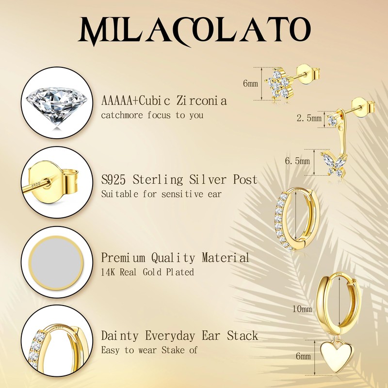 MILACOLATO 4 Pairs Gold Earrings Set for Multiple Piercings, 14K Gold Plated Earring Stack, Hypoallergenic S925 Sterling Silver Post Small Huggie Hoop and Stud Earrings with Cubic Zirconia for Women