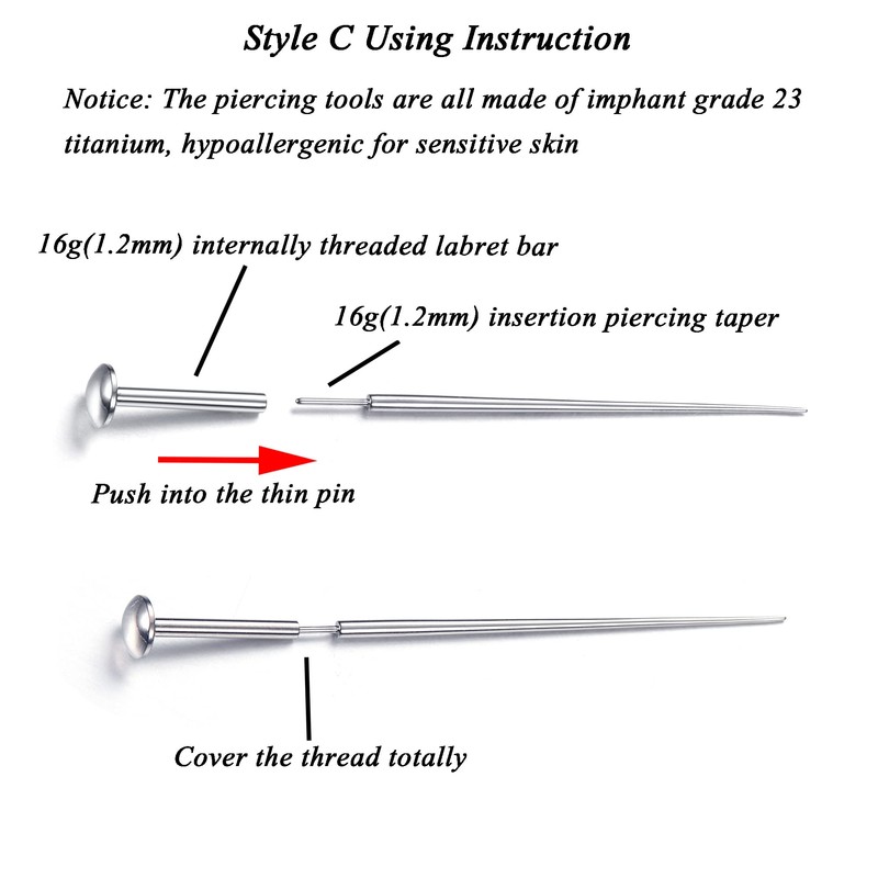 - ✨【Using Instructions】: 1.Put a half part of piercing taper into the ear hole. 2.Push threadless piercing bar into the pin of the taper, then push through totally your ear hole slowly and softly. 3.After through your ear hole, take the taper out of the hole and let the threadless bar stay. 4.Screw the piercing top or bottom. Thin pin at the end helps prevent slipped and cover threadless labret bar to avoid injury while piercing