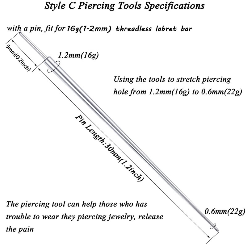 - ✨【Size of Piercing Kit】: Sold as 2pcs, all pierce end is 22g(0.6mm), one taper gauge size is 16g(1.2mm), another is 18g(1.0mm), total length is 30mm (approx 1.2 inch), with a 5mm length thin pin, fit for 16g and 18g threadless labret piercing jewelry