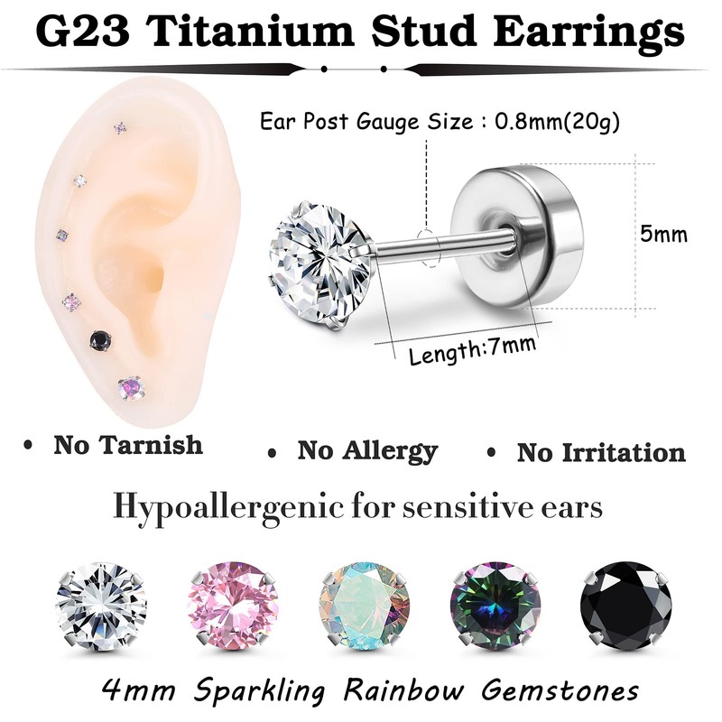 - 🌟【Stud Earrings Set】: Identify Milacolato to get the real g23 titanium earrings. You will get 5 pairs of pure titanium stud earrings, including 1 pairs clear cubic zirconia stud earrings and 4 pairs rainbow cubic zirconia stud earrings. Hypoallergenic earrings set for women, men, girls, best choice for sensitive ears