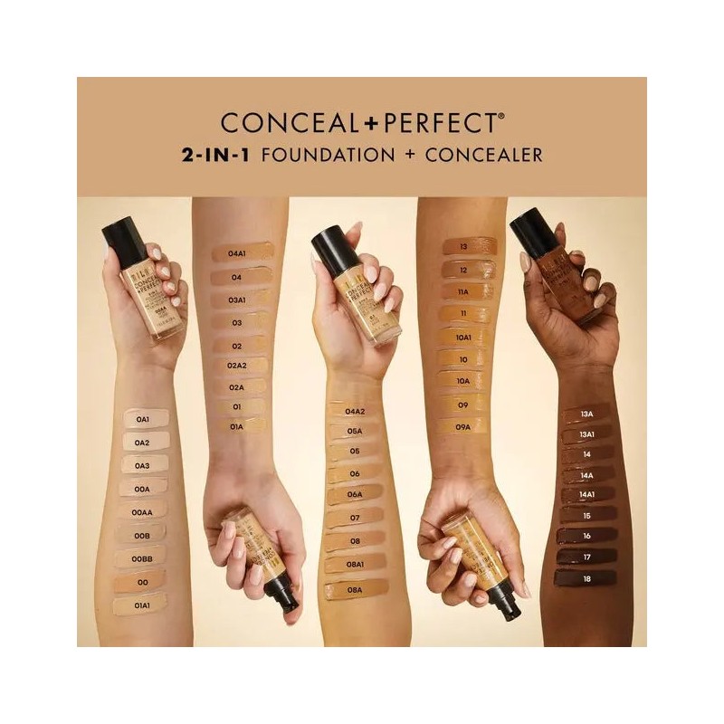 Milani Conceal & Perfect 2-in-1 Foundation and Concealer is a foundation and concealer in one. With this foundation you win the battle against every imperfection on your skin. Whether it's dark circles, red spots or other imperfections, with this full coverage waterproof 2-in-1 concealer and foundation you always work it away perfectly. Because of the handy pump mechanism you do not waste anything and you can dose perfectly for that perfect natural look.