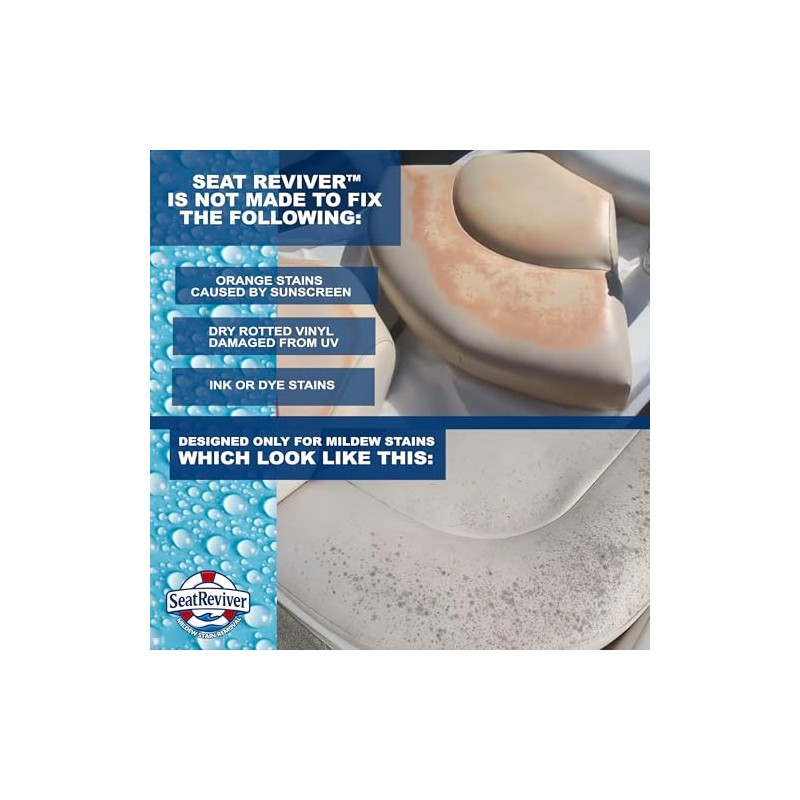 - USING SEAT REVIVER: For safe and effective removal of stains caused by mildew and more, always use in a well-ventilated area and wear personal protective equipment (PPE) during each application.
