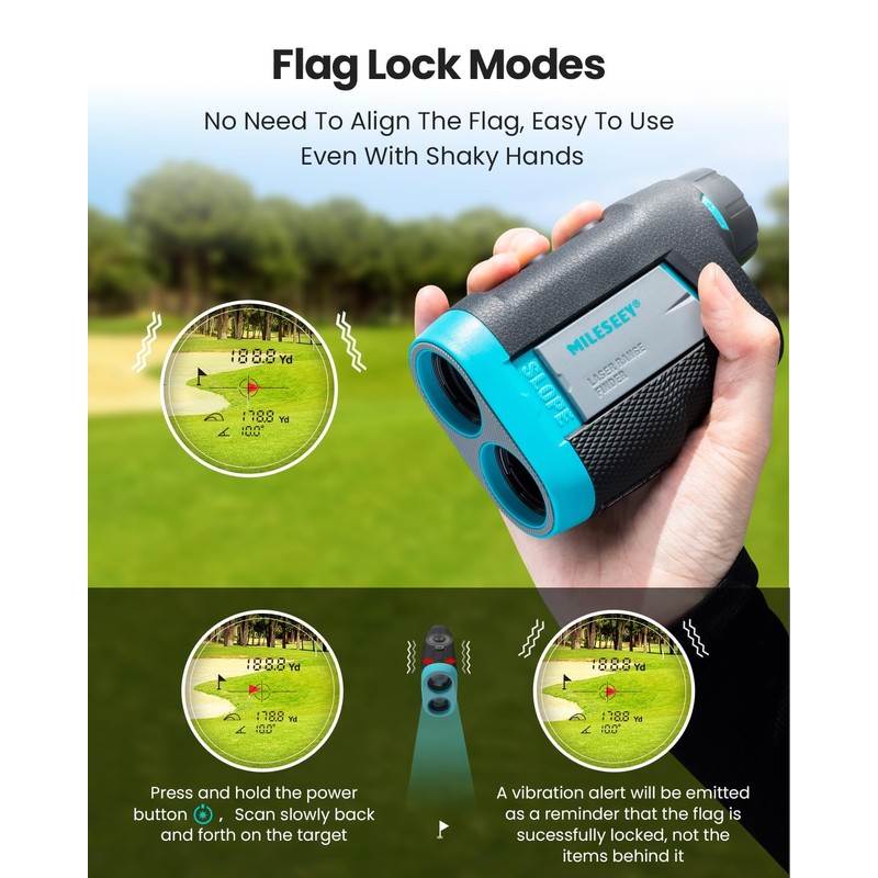 - 🚩【Flag Pin Lock with Pulse Vibration】Experience the next level of precision with our upgraded Flag Pin Lock featuring pulse vibration. Whether on slope Off or On, enjoy the confidence of a short, confirming vibration that assures your golf rangefinder has perfectly locked onto the flag. This advanced technology supports distances of up to 250 yards (Flagpole only), and offers continuous scanning along with the reliable flagpole lock function.