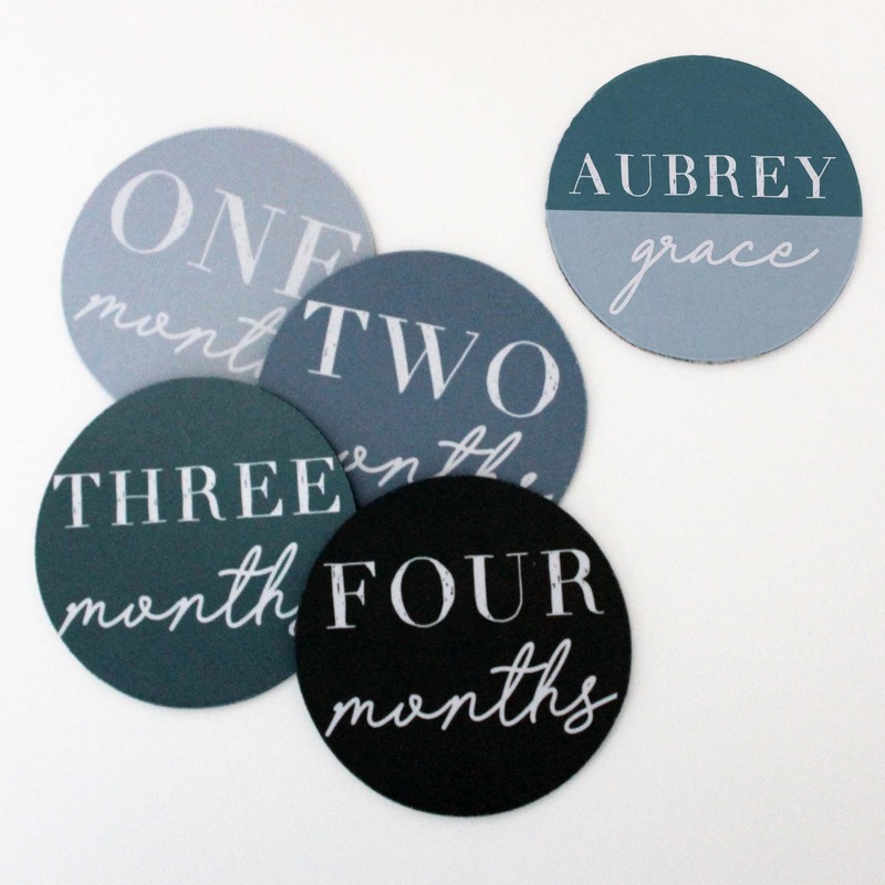 - Personalized Milestone Marker- Etchey offers the perfect addition to capture your new little one every step of the way! Made from 1/8 neoprene circle disks, these Baby Milestone Wood Cut outs will leave a lasting impression for your Baby's Photo Prop shoot. These milestone markers are perfect for baby shower gifts or any gifts for the newborn. This listing is for a full set of baby milestone markers. It includes 1 personalized baby name sign and 1-12 month milestones.