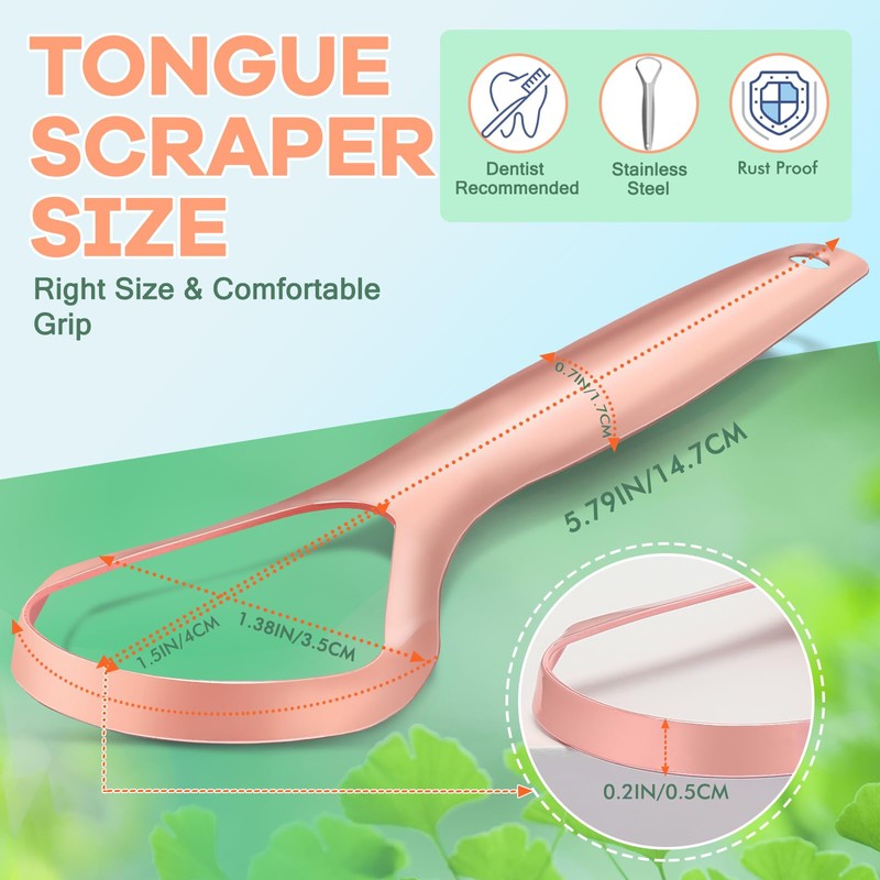 - Stainless Steel: Stainless steel tongue cleaner is sustainable,not easy to deform,to ensure the long-term use of the effect,and has a comfortable will not cause a metallic taste,so that the mouth is more refreshing