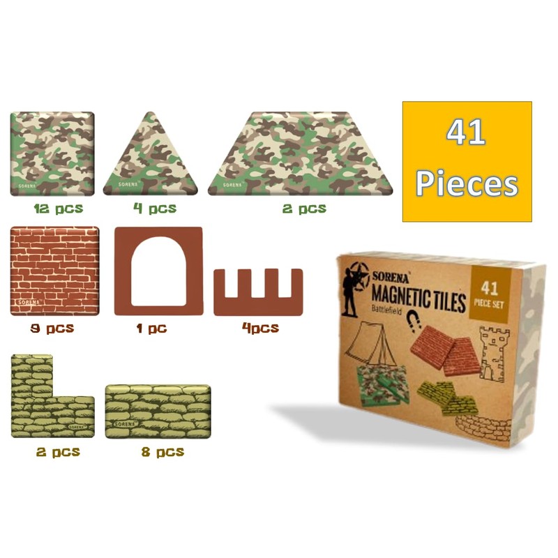 - Engaging Military Theme: The Battlefield Magnetic Tiles set features a fun and engaging military theme that includes castle, tent, and sandbag designs. With 41 colorful and durable tiles, your child can build their own military fortress, terrain, bunkers, create their own battlefield scenarios, or explore their creativity with different vehicles and equipment used in battle.