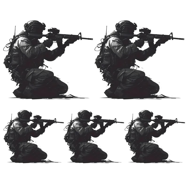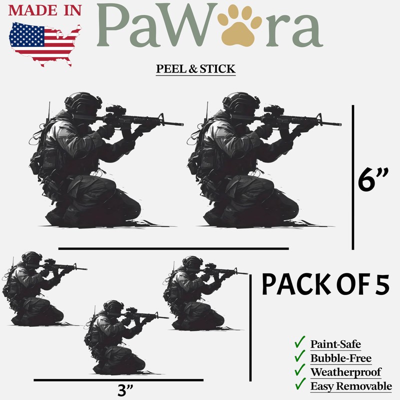 Military Sniper Sticker Pack of 5 – Tactical Infantry Shooter Vinyl Decals for Car, Laptop, Gun Safe, Helmet, Water Bottle – 2 at 6" and 3 at 3" – Removable Waterproof Army Soldier Silhouette