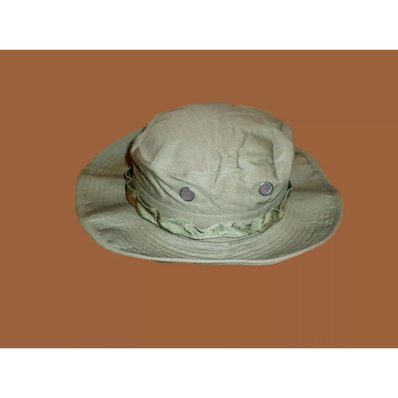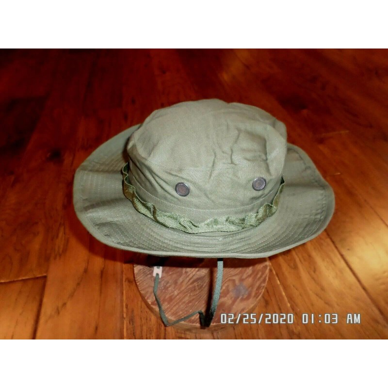 Genuine U.S Military Vietnam Issue 1969 Dated OD Green Boonie Jungle Hat. OG-107 Olive Green Shade 107. Rip-Stop Cotton Poplin Material With Quarpel Repellent Treatment. Insect Net Included. Adjustable Chin Strap With Leather Slide Lock Keeper. Two Brass Screened Air Vents On Each Side. Size is A 6 7/8" USA Made. All Hats Are New In Bags. All of our products are in stock and shipped the same day or the next morning.