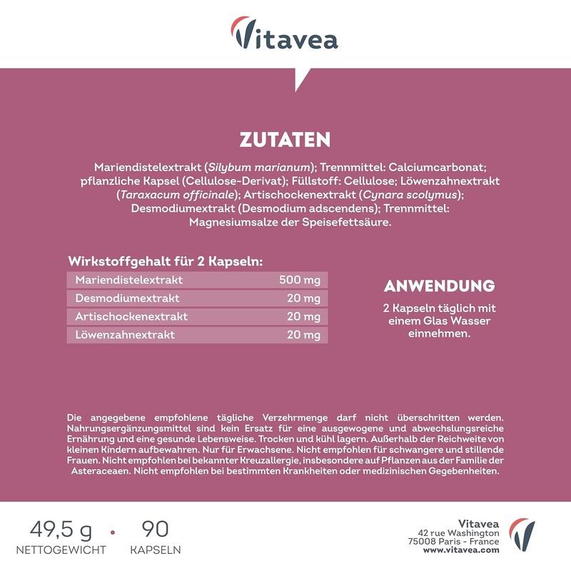 Milk thistle extract (Silybum marianum), calcium carbonate (anti-caking agent), vegetable capsule (cellulose derivative), cellulose (filler), dandelion extract (Taraxacum officinale), artichoke extract (Cynara scolymus), desmodium extract (Desmodium adscendens), magnesium salts of fatty acids (anti-caking agent).