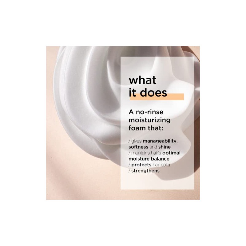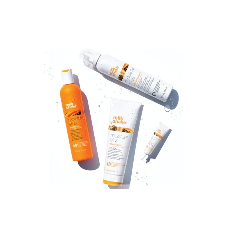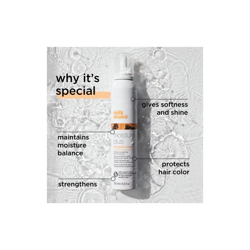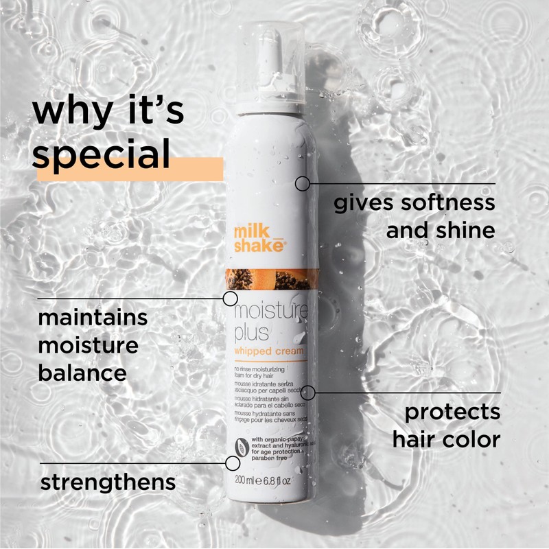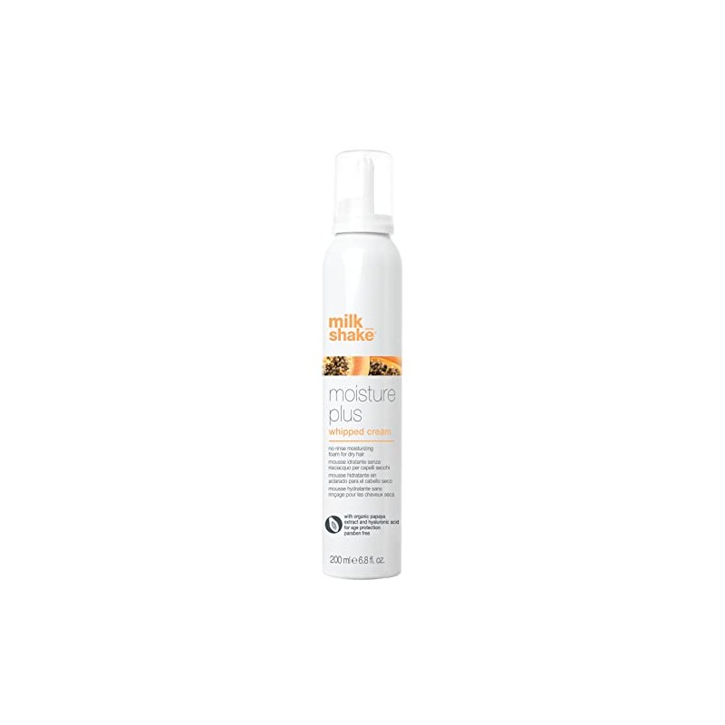 milk_shake moisture plus whipped cream is a no-rinse moisturizing foam for dry hair. It improves softness and manageability while maintaining optimal moisture balance. Leaves hair soft, shiny and healthy. Milk_shake moisture plus whipped cream contains organic papaya extract, Integrity 41 and hyaluronic acid with anti-aging properties. As well it protects hair color from fading.
