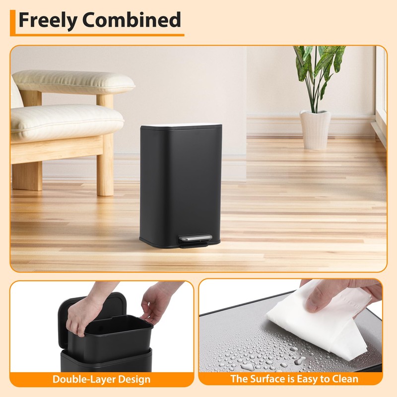 - High-Quality Matte Finish: Crafted from robust stainless steel, this trash can comes with a stainless steel lid and foot pedal, and is finished with a matte powder coating. The result is a fingerprint-resistant and scratch-proof exterior that not only looks sophisticated but is also incredibly easy to clean and maintain, ensuring long-lasting beauty and functionality.