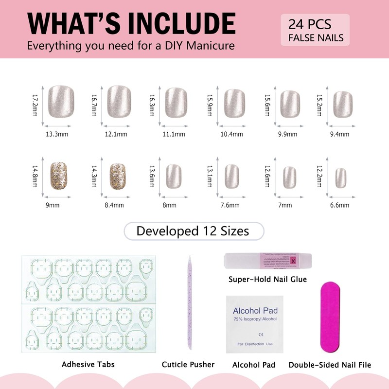 - 24 Nails in 12 Sizes: Various nail sizes ensure a totally custom fit, plus we give you extras just in case! Each set comes complete with a storage box, nail glue, adhesive tabs, double-sided nail file, cuticle stick, and alcohol pad.