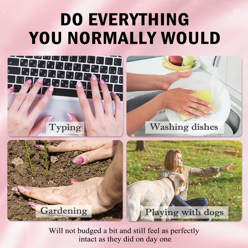 - Do Everything You Want: High-quality is our middle name.This reusable nail set can be trimmed, filed, or polished to your liking. Do everything you want, such as typing, gardening, houseworking or playing with your pet. They will not budged a bit and still feel as perfectly intact as they did on day one.