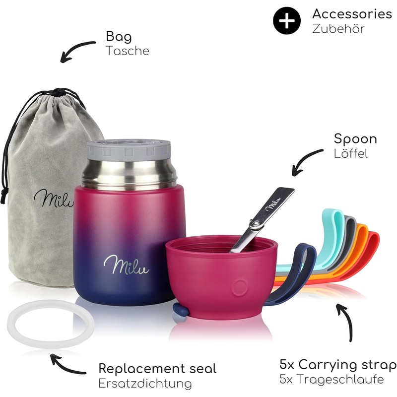 Milu® Thermal Container for Food 800 ml, Stainless Steel, Thermal Lunch Box, Soup Container to Go, Thermal Box for Keeping Warm Soups, Baby Porridge, Food Container, Porridge Warmer on the Go, Berry